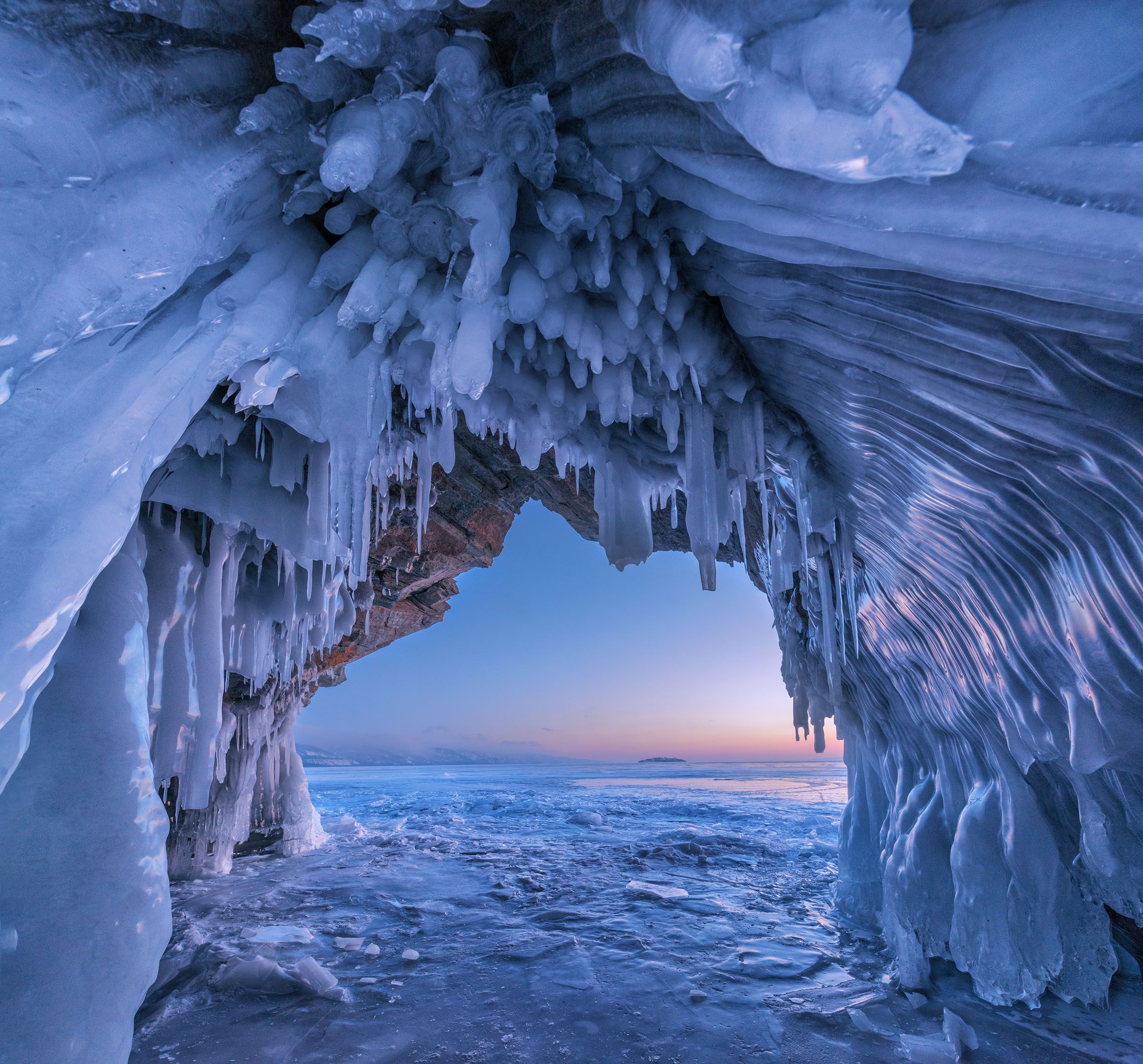 На острове Огой несколько пещер, две из них на северной стороне смотрят на северо-восток, другие две, не такие выигрышные, на запад. Мы ездили три раза на утренние съемки к Огою. Этот снимок состоит из трех горизонтальных снимков. Объектив Nikon 14-24 мм, фокусное расстояние 14 мм.