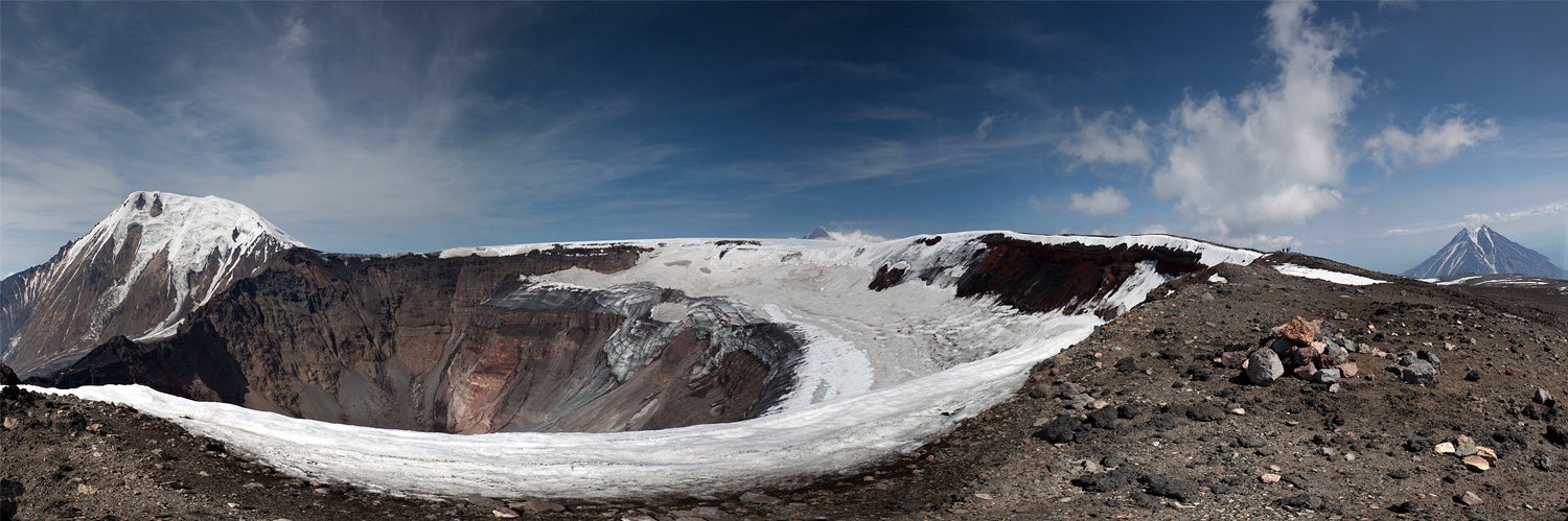 На снимке вершина вулкана Плоский Толбачик высота 3085 метров и диаметром 3 км. Кратер вулкана имеет внушительные размеры диаметр около 1800 м. и глубина 500 м. До БТТИ (Большое трещинное Толбачинское извержение) в 1975 году кратер был меньшим размером и внем было небольшое лавовое озеро. Справа виден конус вулкана Большая Удина