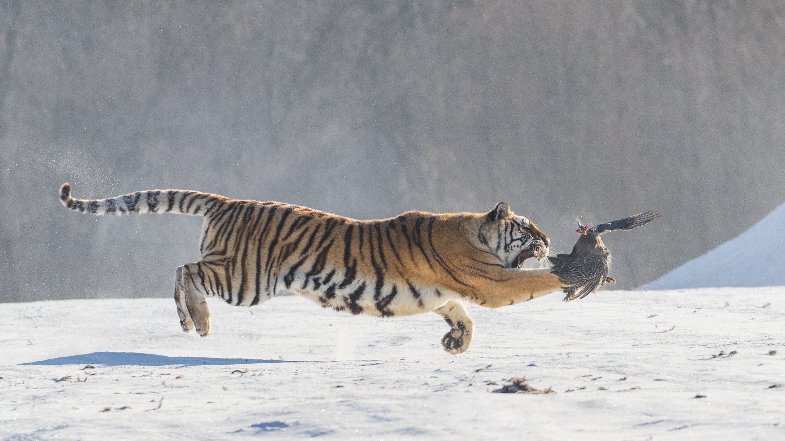 Прелестно. Тигр в полете. А у цесарки, похоже, день не сложился)