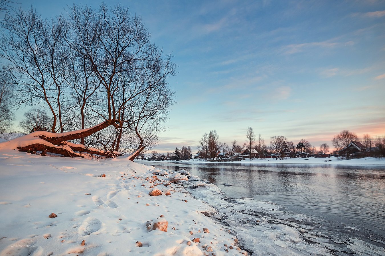 зима, берег, лед, деревня, река, деревья, Татьяна Афиногенова