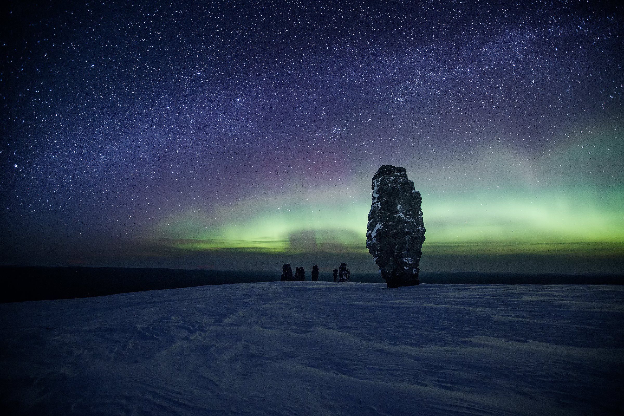 Есть выражение "Гора пустила", когда на восхождении внезапно расчищается небо, прекращается ветер и гора милостиво разрешает уставшим путешественникам подняться на её вершину. В нашем случае в погодные дела вмешались семь каменных идолов плато Маньпупунёр, позволив нам насладиться ясным и звёздным небом над ними!