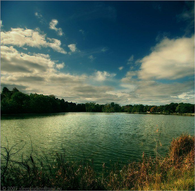 Вообще-то это река, течет только странно:-) То узкая как ручей, то как озеро. Очень долго ждал такого сочетания. Небо большей частью безоблачное, скучное. Очень благодарен Вам за сказанное!