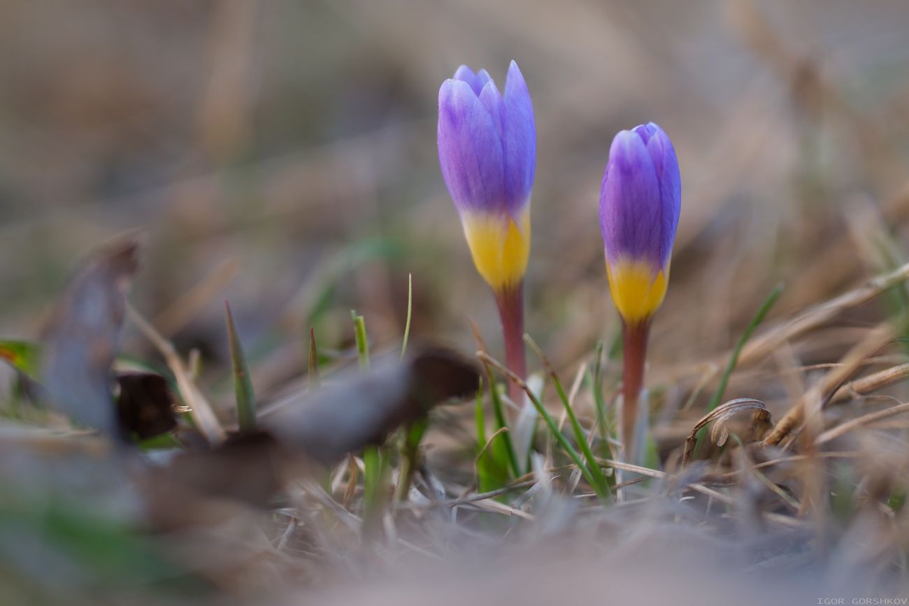 Крошечные крокусы на склоне берега на Борисовских прудах. Москва, Борисовские пруды. Апрель 2018. Макрообъектив Волна-9 Макро