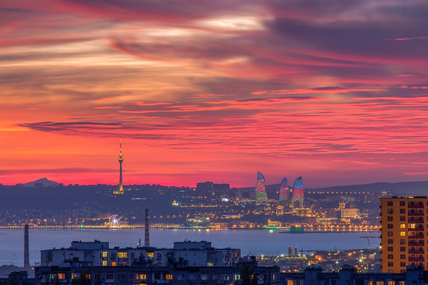 закат, небо, красный, пейзаж, город, архитектура, здания, море, Баку, Азербайджан, Денис Свечников