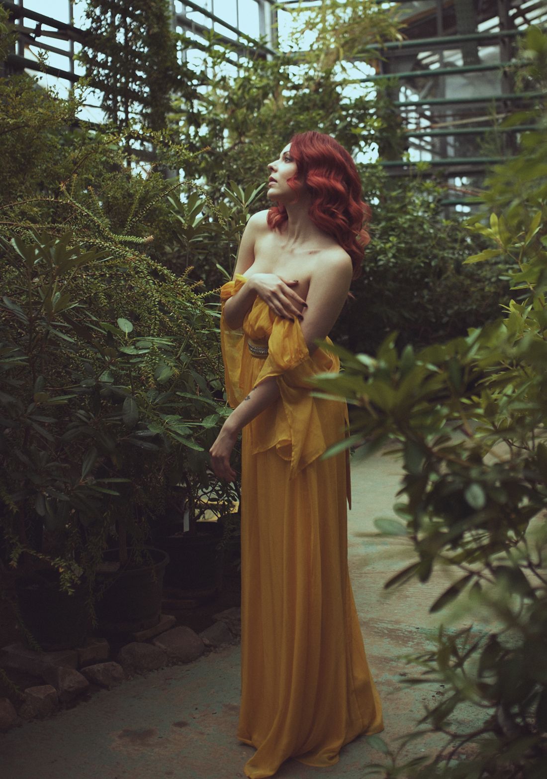 портретмодельоранжереяботаническийсаджелтоеплатьежелтыйрыжаядевушки
