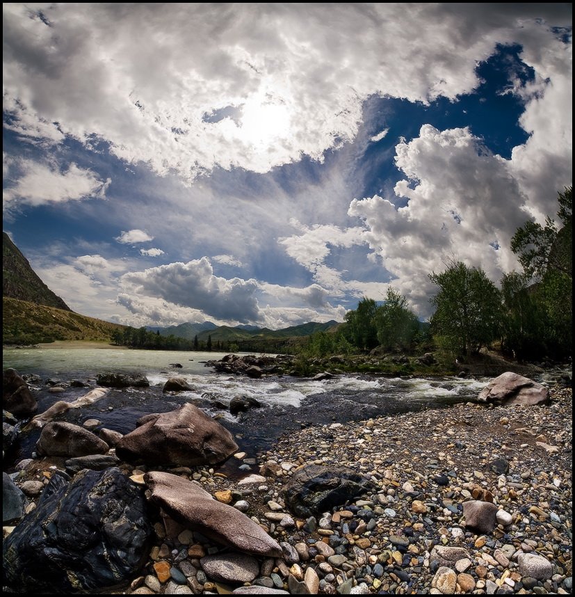 Устье притока Ильгумень, впадающего в реку Катунь. 4 кадра в 2 ряда.