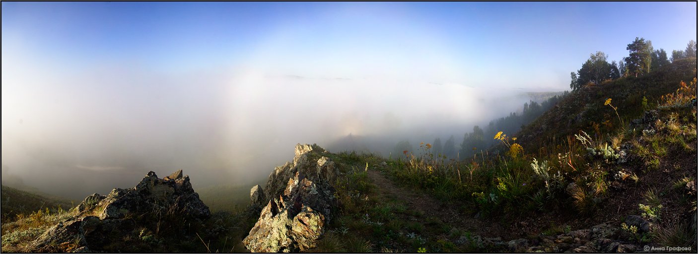 Это что то типа гало или радуги напротив от солнца на тумане, солнце четко у меня за головой вставало! Я честно говоря сама впервые с этим явлением столкнулаь , поэтому только могу предположения строить! :-)