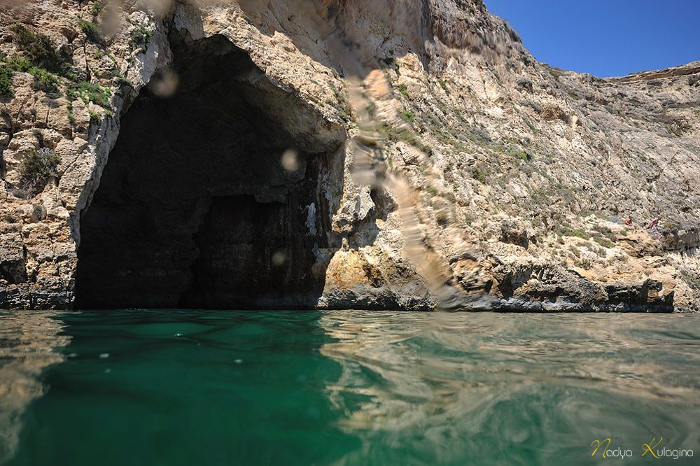Один из самых красивых дайв сайтов на острове Гозо - Dwejra Point или внутреннее море. Это небольшой естественный бассейн, закрытый от моря высокой скалой. Внутреннее море соединяется с внешним длинным 35-метровым тоннелем, стенки которого уходят вниз на глубину ниже 35 метров. Интересен этот сайт своими контрастами. Внутреннее море - зеленое и теплое, внешнее - синие и холодное. Температура на внешней стенке не превышает 20-22 градусов, а на глубине 17-19 метров - термоклин, при котором температура падает до 17С. Тишину этого места нарушают только моторные лодки, катающие туристов по темному коридору.