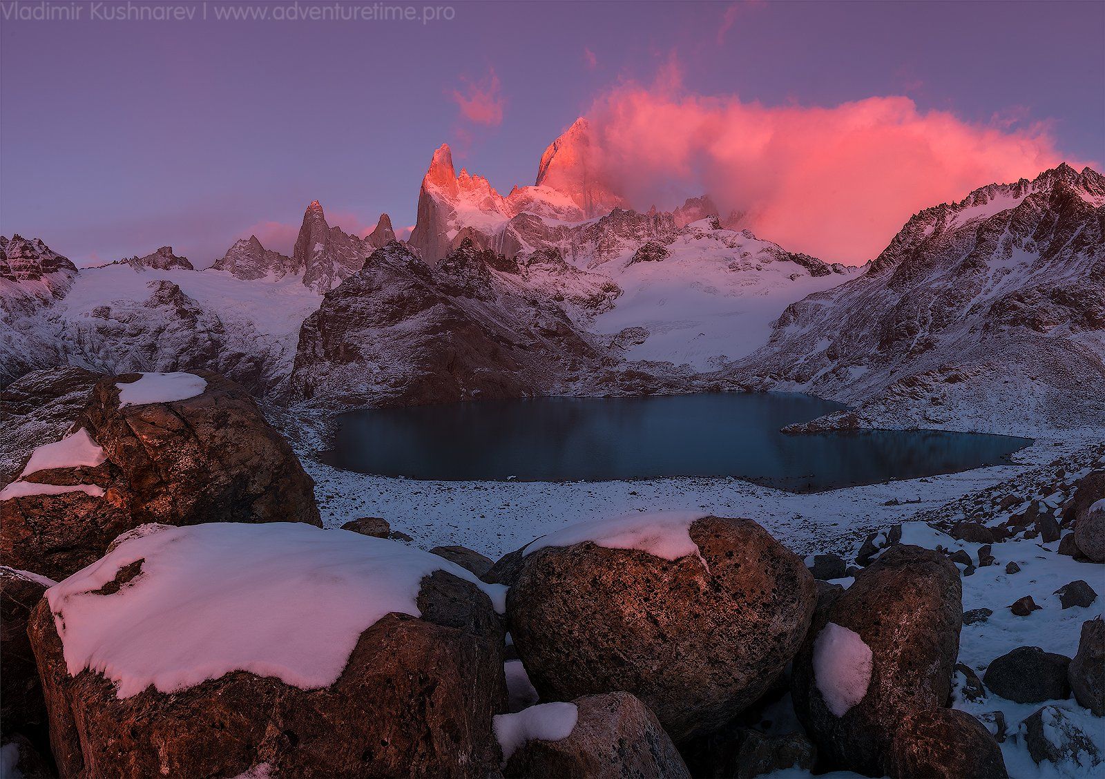 Бодрый подъем в 5 утра, готовлю, почти с закрытыми глазами, кофе для группы. Кто-то встает сам, кого-то окликнули. Группа разделяется. Сергей, Аня и Наташа собрались на перекаты, а мы должны идти наверх, к лагуне. Ночью были заморозки. На ближайшем ручье, где я приметил небольшой затишок, наверняка получится поcнимать обледеневшие закраины. Алексею и Володе сообщаю как можно более уверенным голосом, что на лагуну уже не собираюсь. По правде, я слегка подустал за предыдущие несколько дней, и решил по-легкому "сачкануть" на друзьях. Мне так не хотелось идти эти 2,5 часа до лагуны, по этим обледеневшим ступенькам, высотой в строительный блок ФБС. "Предательство" быстро нашло отклик в сердцах коллег, которые не только пообещали отформатировать ночью мои флэшки, но и подпилить ноги штатива, если первое не подействует. Ну чо сразу то не сказали? Зачем сразу дружбу то рушить?))) На Лагуну так на лагуну. За легким трепом и шутками про мои отформатированные флэшки, прошли 2,5 часа подъема. Наверху сильно дуло. В спальном мешке, опершись спинами на большие валуны уже сидела и ворковала парочка из Франции. В руках у них дымились кружки, а ветер доносил до нас прекрасный запах кофе. Мы расставились, достали термос и стали ждать. Случился прекрасный, но не долгий свет. На Солнце, встающее за нашими спинами, вскоре наползли тучи, и все безнадежно погасло. Спасибо тебе, Фитц-Рой. Так я сохранил в целости материал на картах памяти и, вероятно, штатив)))