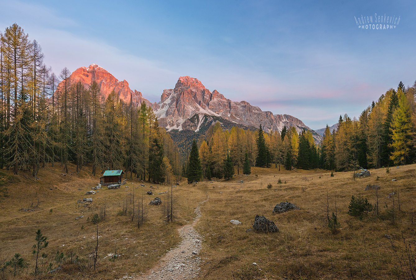В начале почти четырёхчасового трека на одно горное озеро в Доломитах, в моем фототуре в октябре 2017.
