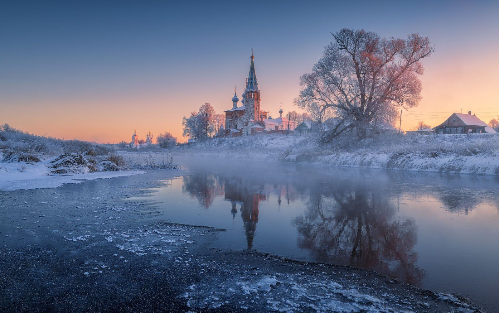 Утренний пейзаж села Дунилово в Ивановской области, где река Теза покрыта льдом и тонким слоем инея. На фоне розово-синего неба выделяется силуэт старинного храма, чьё отражение в воде создаёт симметричную композицию. Ветви деревьев, усыпанные инеем, словно кристаллы, мерцают в свете восходящего солнца. Фотография передаёт тишину и красоту зимнего утра в русской глубинке. Фото: Михаил Дубровинский.