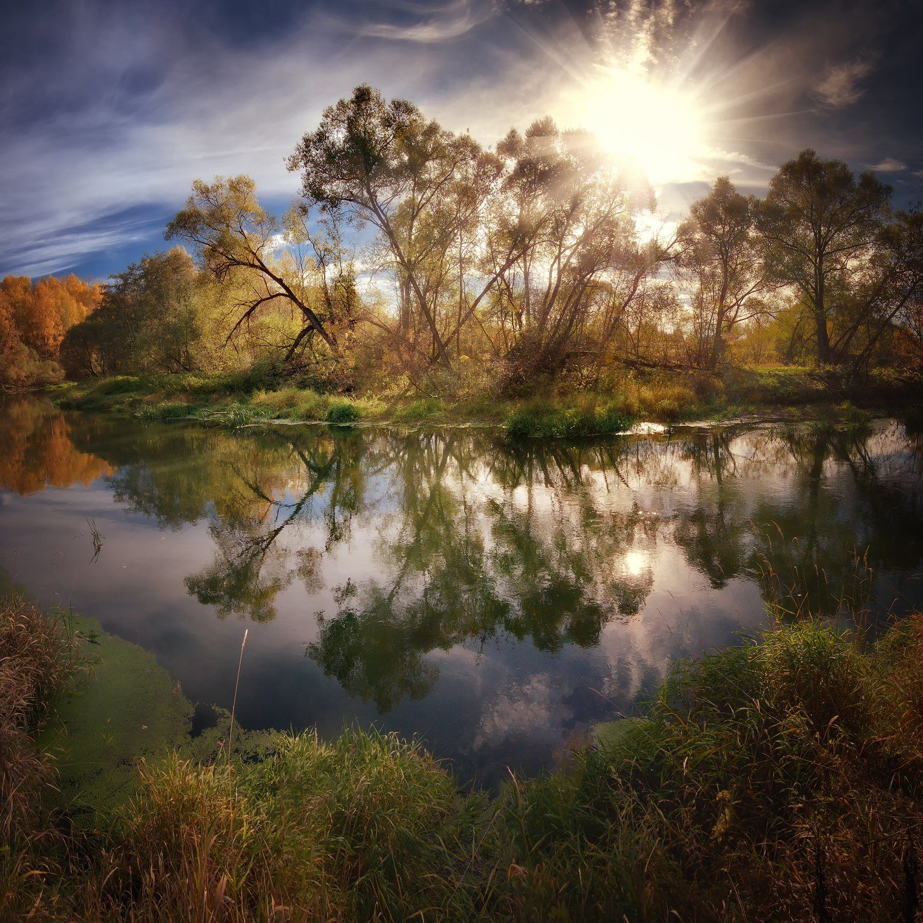 лес, природа, пейзаж, осень, река, вода, ручей, подмосковье, закат, лучи, солнце, Алексей Никонов