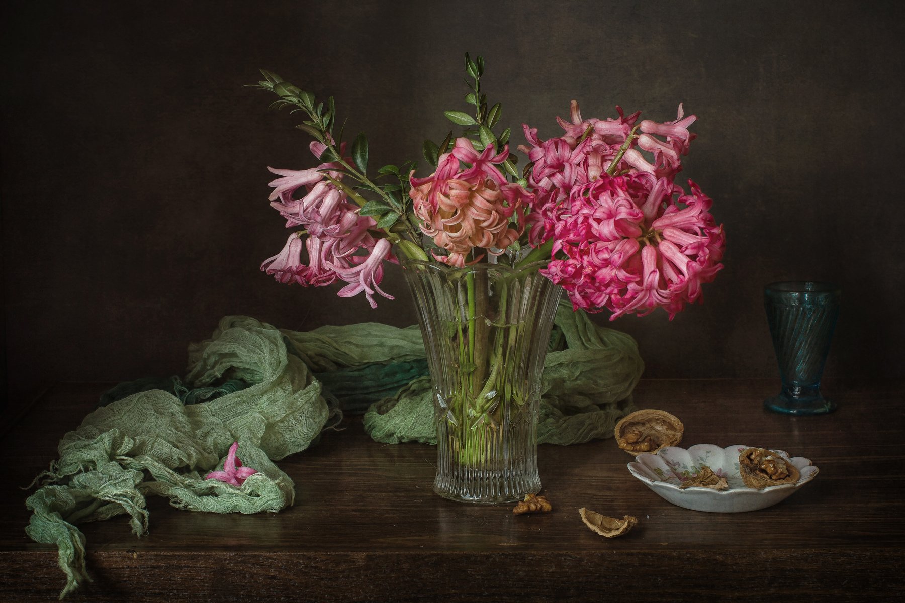натюрморт, стекло, фарфор, цветы, гиацинты, орехи, Анна Петина