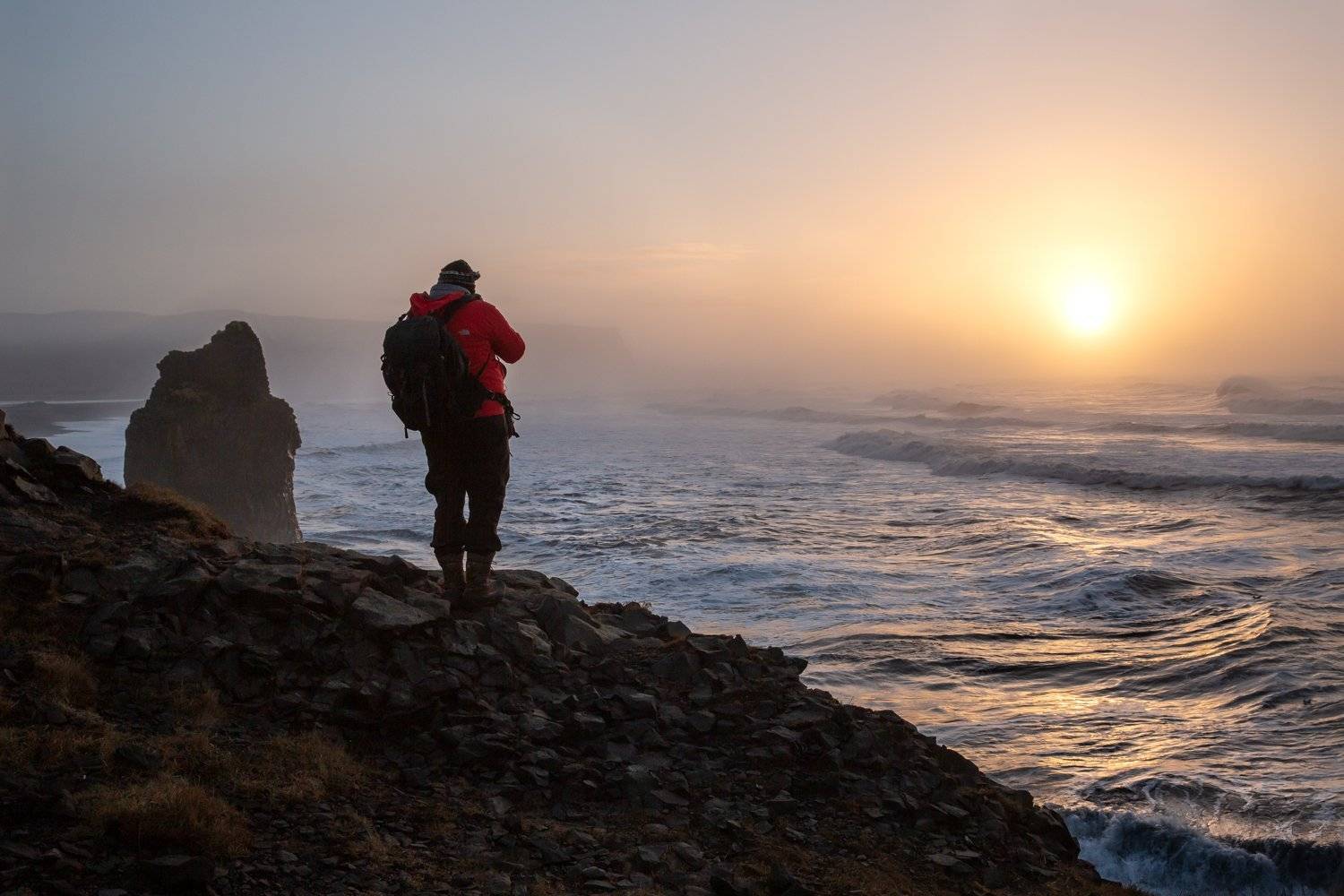 Каменный троль и фотограф встречают рассвет ( Исландия, Вик)