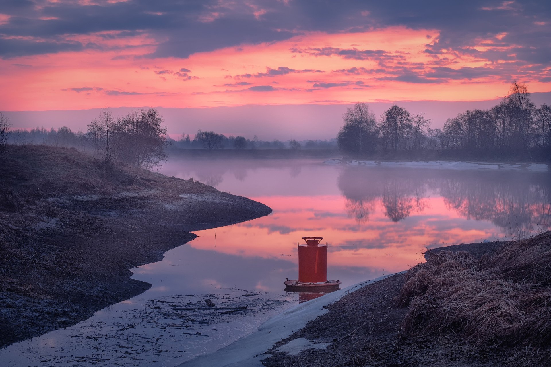 дубна, река, апрель, бакен, весна, вода, рассвет, небо, отражения, туман, пейзаж, Андрей Чиж