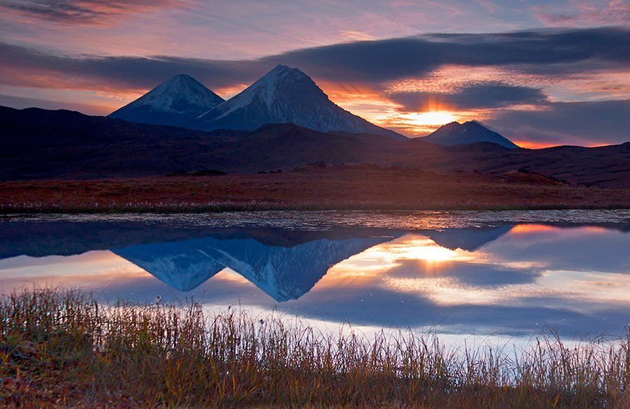 Камчатка. С лева на право вулкан «Ключевская сопка», вулкан» Камень» и вулкан «Безымянный» Когда-то этот пейзаж выглядел иначе. Знаменитое катастрофическое извержение вулкана Безымянный 30-го марта 1956 года уничтожило 2/3 его постройки и было выделено Г.С. Горшковым и Г.Е. Богоявленской в самостоятельный тип – «Направленный взрыв» или «Тип Безымянный», который признан мировой вулканологией («directed blast», «lateral blast», «type Bezymianny»). До извержения постройка вулкана имела форму правильного конуса высотой 3085 м. сейчас высота вулкана 2882 м. На данный момент вулкан находится в стадии извержения из его жерла идет медленное выдавливание лавового потока. Вулкан посещаем туристами они как правило поднимаются на гребень старой постройки. Внутри которой находится новая постройка от куда и идет выход лавы.