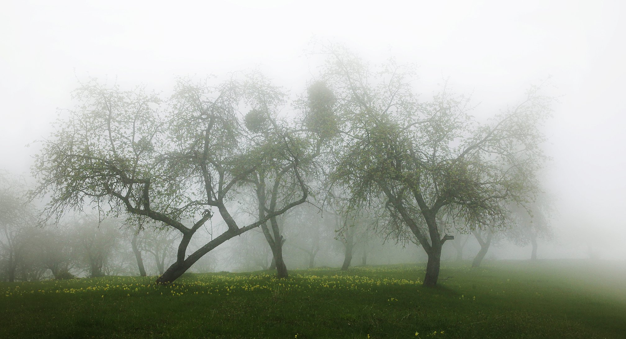 Люблю туманы.., особенно такие, когда ПП виден, а дальше уже есть воля для фантазии... Эта картинка хороша ещё тем, что форма переднего плана заставляет вспомнить о форм нашей Земли-Матушки, а ведьмины мётла своей формой этому только помогают...