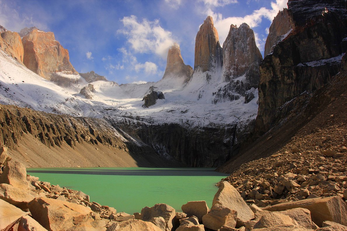 Поднимались часов 5 в дождь. Все, кто спускались - отговаривали: торресы не видно, облака и туман...но все же мы с тупой настойчивостью - шли... Распогодилось минут за 15 до этого снимка, а потом опять все затянуло: повезло.