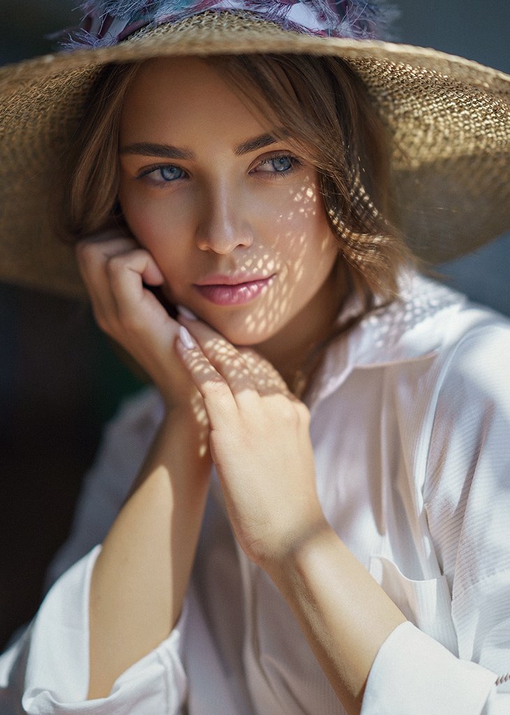 На снимке — Анна, молодая женщина, позирующая на фоне природы. Её лицо озарено мягким солнечным светом, создающим тёплые блики и тени. Широкополая соломенная шляпа и белая блузка подчёркивают лёгкость и естественность образа. Глаза смотрят прямо, выражая спокойствие и внутреннюю гармонию. Фотография передаёт атмосферу тёплого летнего дня, наполненного светом и умиротворением. Работа Алексея Казанцева.