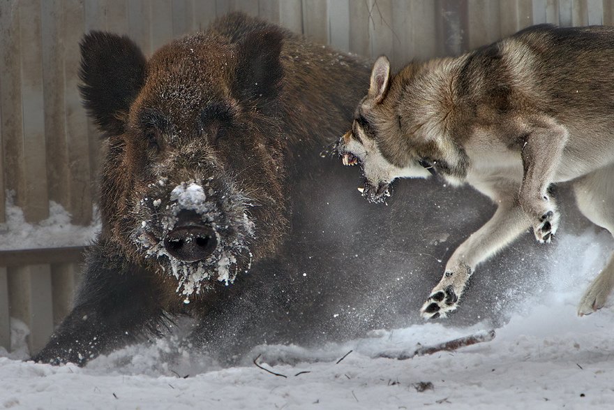 Ирина - собаке без вариантов справиться с вепрем - факт известный. Собаки от запаха сходят с ума (кабан, медведь и т.д.) запах силы и смерти для пса вынуждает его на защиту нападением. Бывают позитивные моменты для охотника от использования собак (по себе знаю), но противопоставлять одну силу (дикую) другой (домашней, вскормленной) не стоит. Кадр хорош.