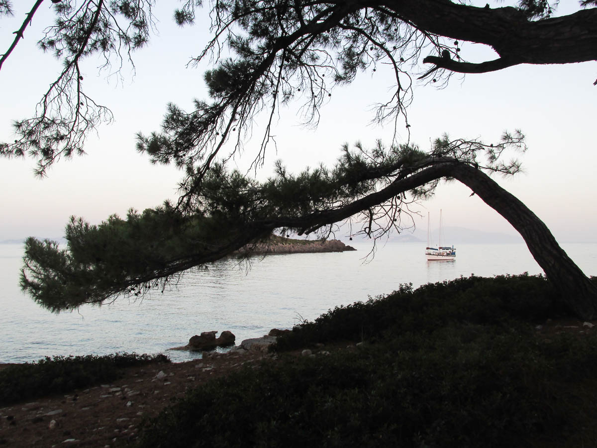 море, берег, дерево, лодка, парусник, средиземное море, Сергей Козинцев