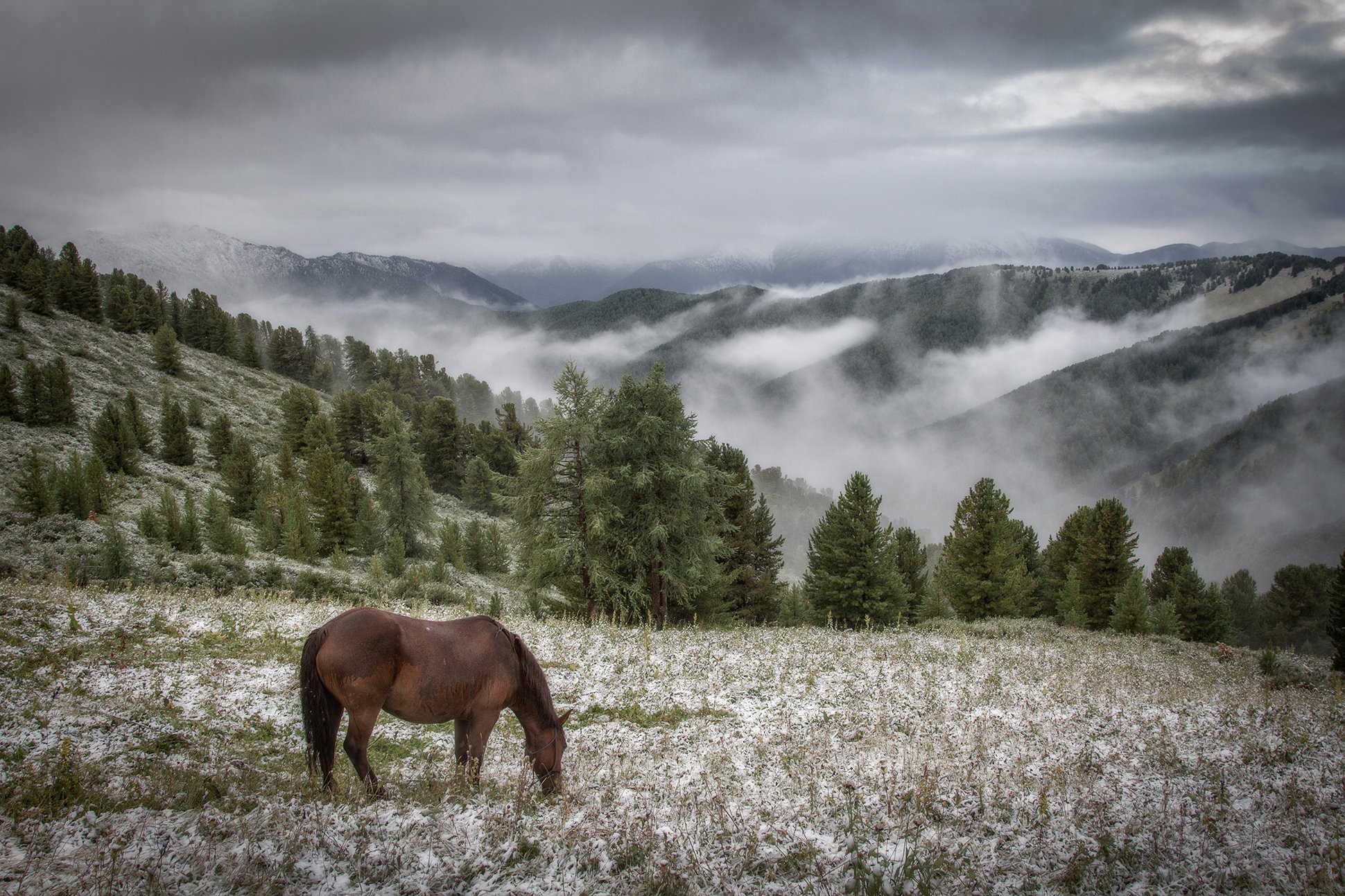 пейзаж, алтай, снег, горы,лето,август, лошадь, Тамара Андреева