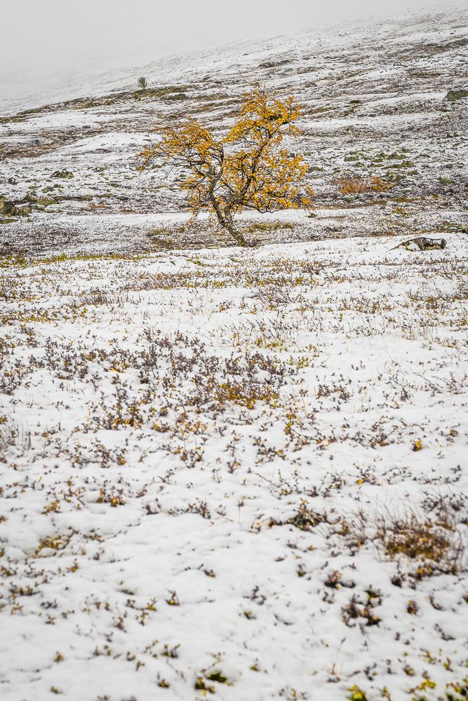 Almost abstract look of situation when autumnal colours meets winter whites... Sylan mountains, middle Norway.