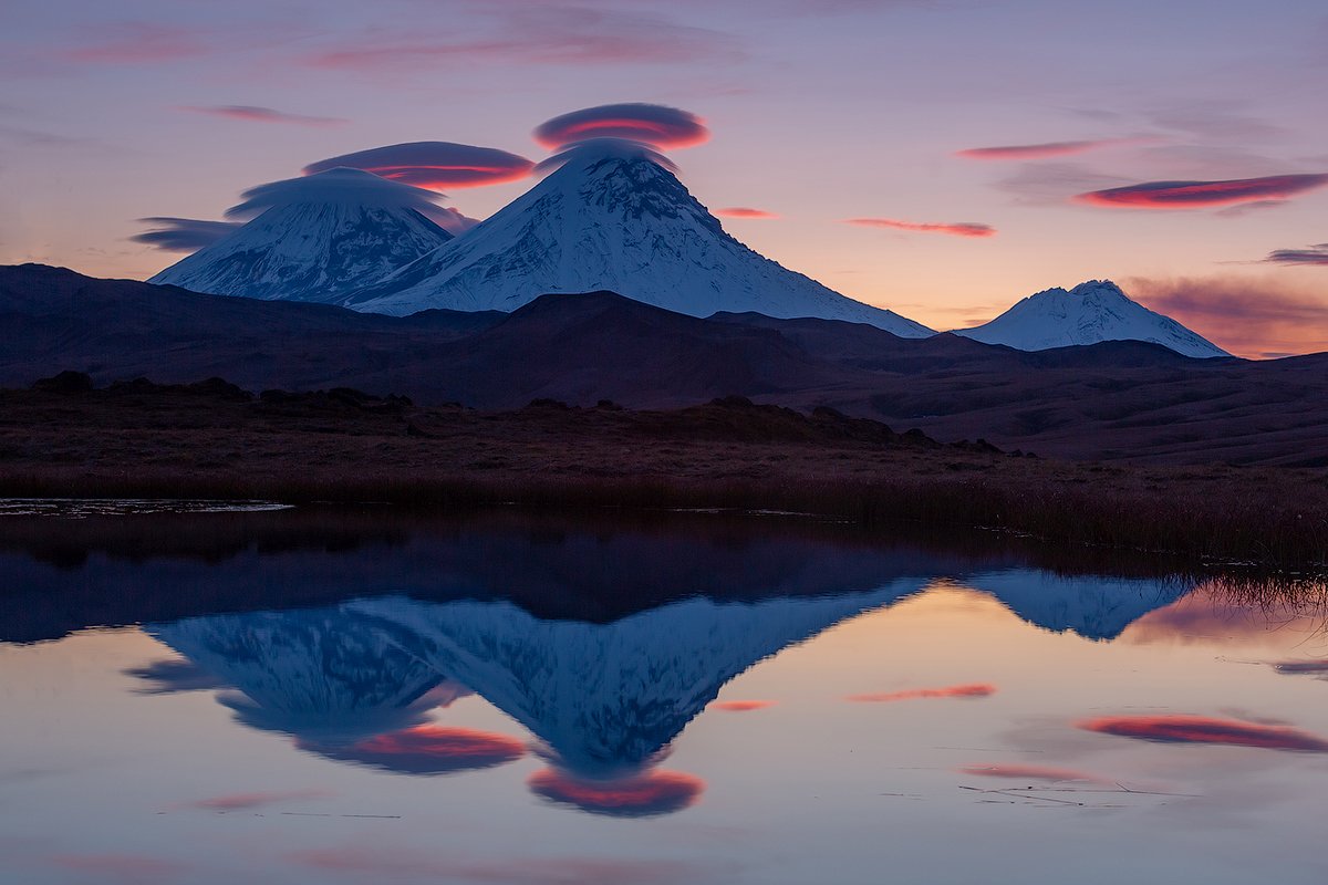 Лентикулярные облака над вершинами вулканов Ключевской и Камень