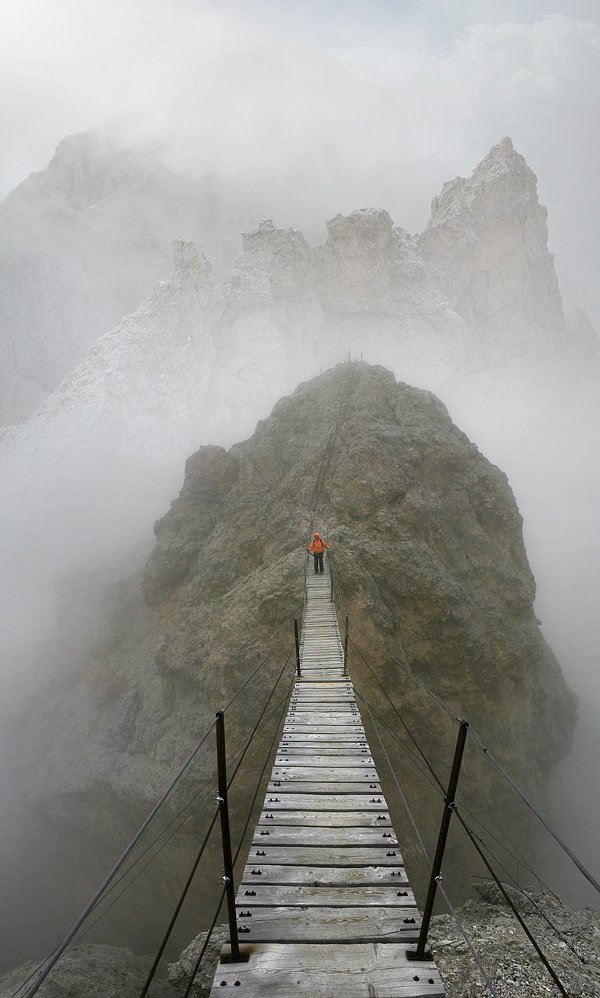 Видел как на таких мостах люди в ступор впадают и не могут пошевелиться от страха... Надеюсь этот маленький человечек смел и в конце будет все хорошо :)