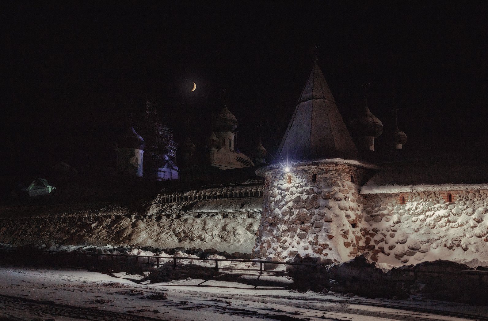соловки, монастырь, снег, зима, ночь, Владимир Липецких