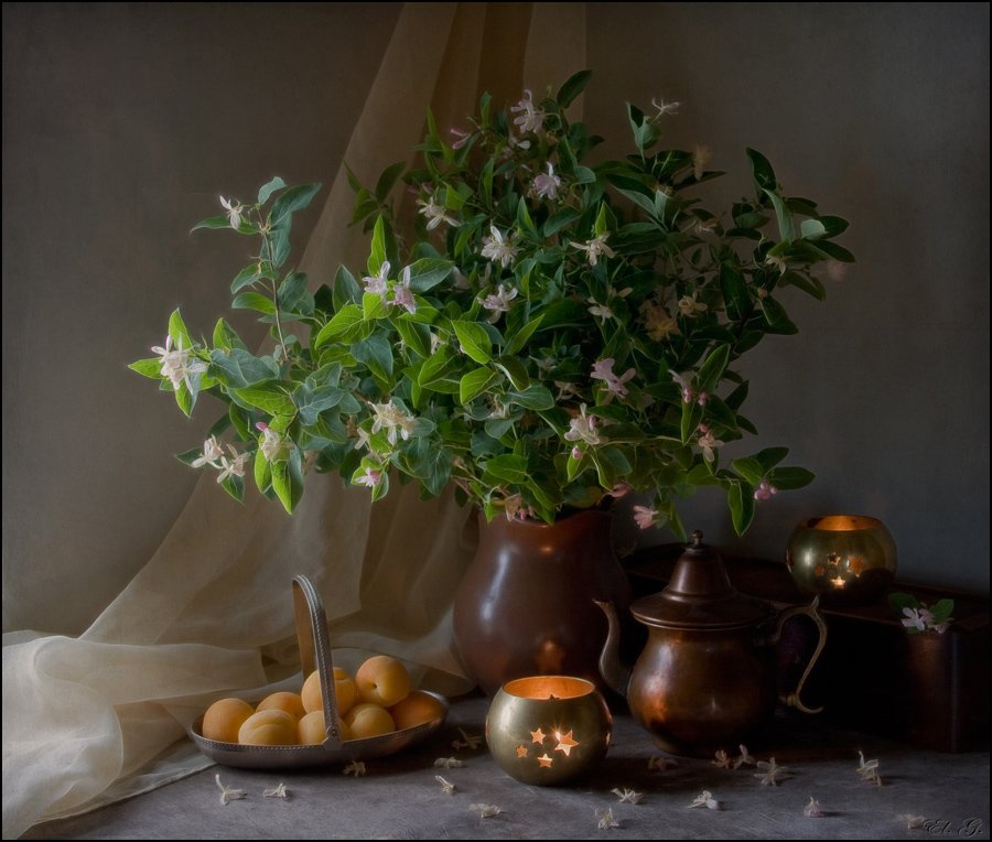 натюрморт, лето, свечи, цветы, жимолость, абрикосы, El. G.
