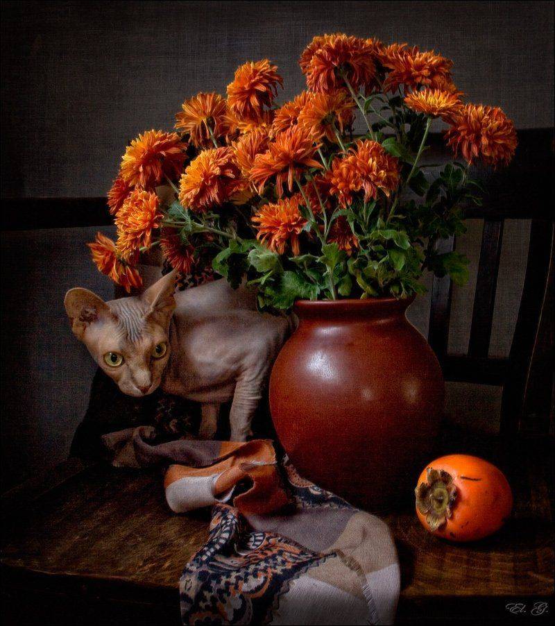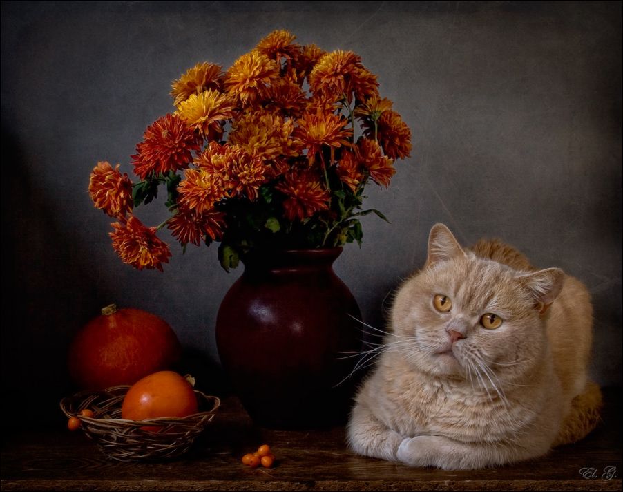 Получилась такая забавная серия с осенним букетом и оранжевыми фруктами-ягодами. Кошек не планировала снимать, но потом как-то неожиданно всё закрутилось)))