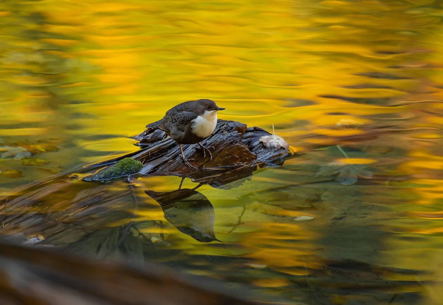 Оляпка (лат. Cinclus cinclus) — птица отряда воробьинообразных. Её также называют водяной дрозд, или водяной воробей. Обитает по берегам быстрых прозрачных рек и ручьев. Питается водными насекомыми и рачками, а иногда и мелкой рыбой, которых оляпка собирает на мелководье, между камней и под водой. Главной особенностью являются способность хорошо плавать и нырять. Приподнимая крылья и ловко маневрируя в потоке воды, птица как бы «бежит» по дну. Под водой оляпка может оставаться до 50 секунд, пробегая за это время до 20 м. Оляпка (норв. fossekall) считается национальной птицей Норвегии. Также оляпка включена во многие региональные Красные Книги России. Золотая осень на Бадукском озере в горах Домбая. Тебердинский государственный природный биосферный заповедник. Начало октября, 2019 г. Фотопроект «Кавказ без границ».