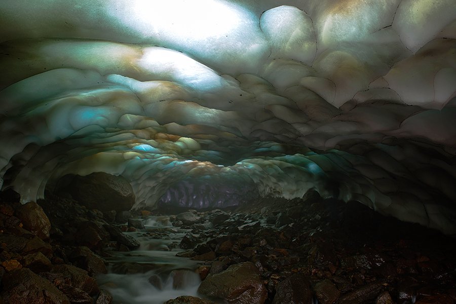 Вулкан Мутновский. Зимой в районе вулкана Мутновский выпадает очень много снега и летом он остается лежать только глубоких ложбинах, а там где течет ручей под снежниками образуются вот такие пещеры.