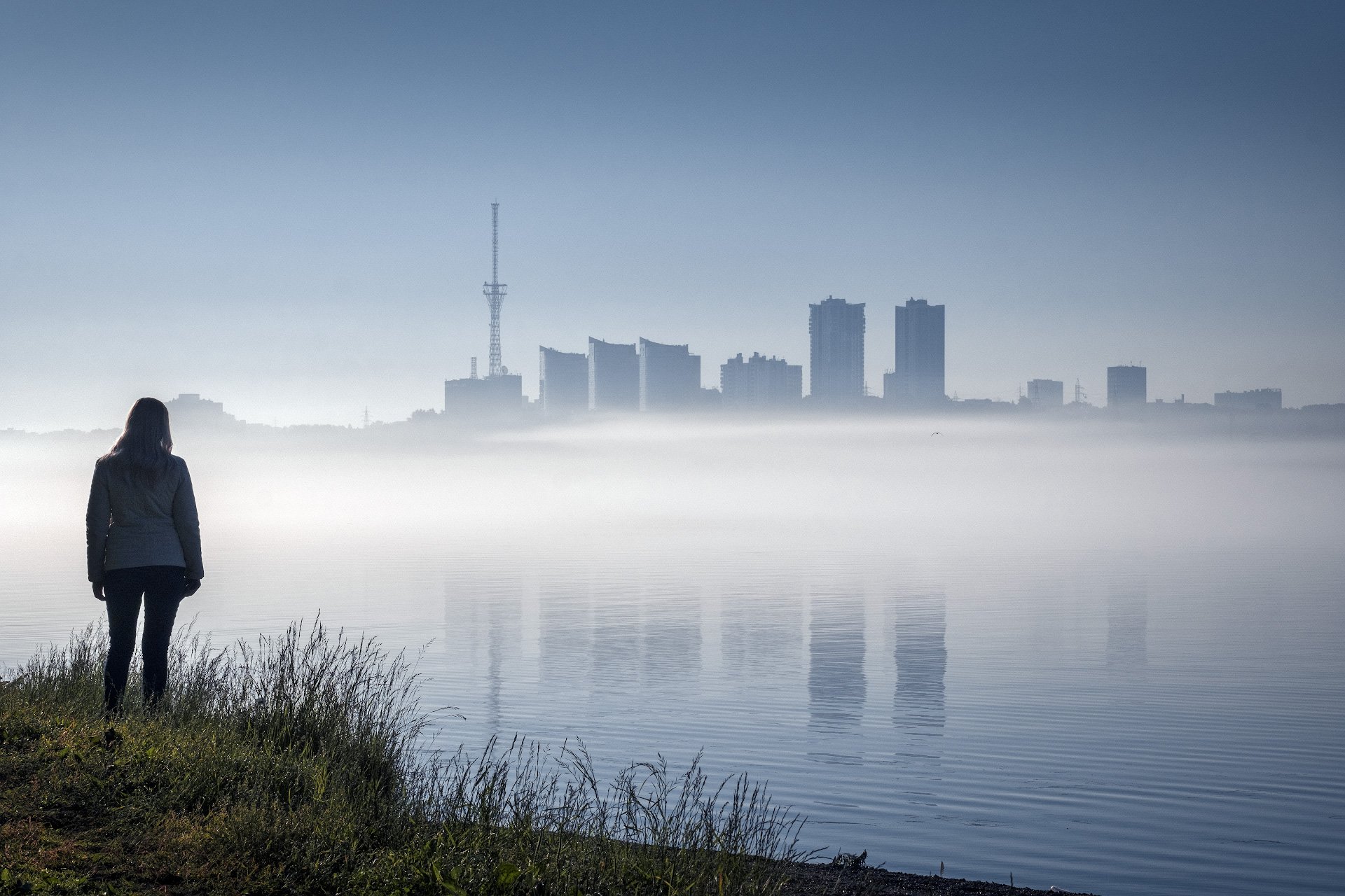 город, река, туман, утро, небо, отражения, девушка, чайка, пермь, Андрей Чиж