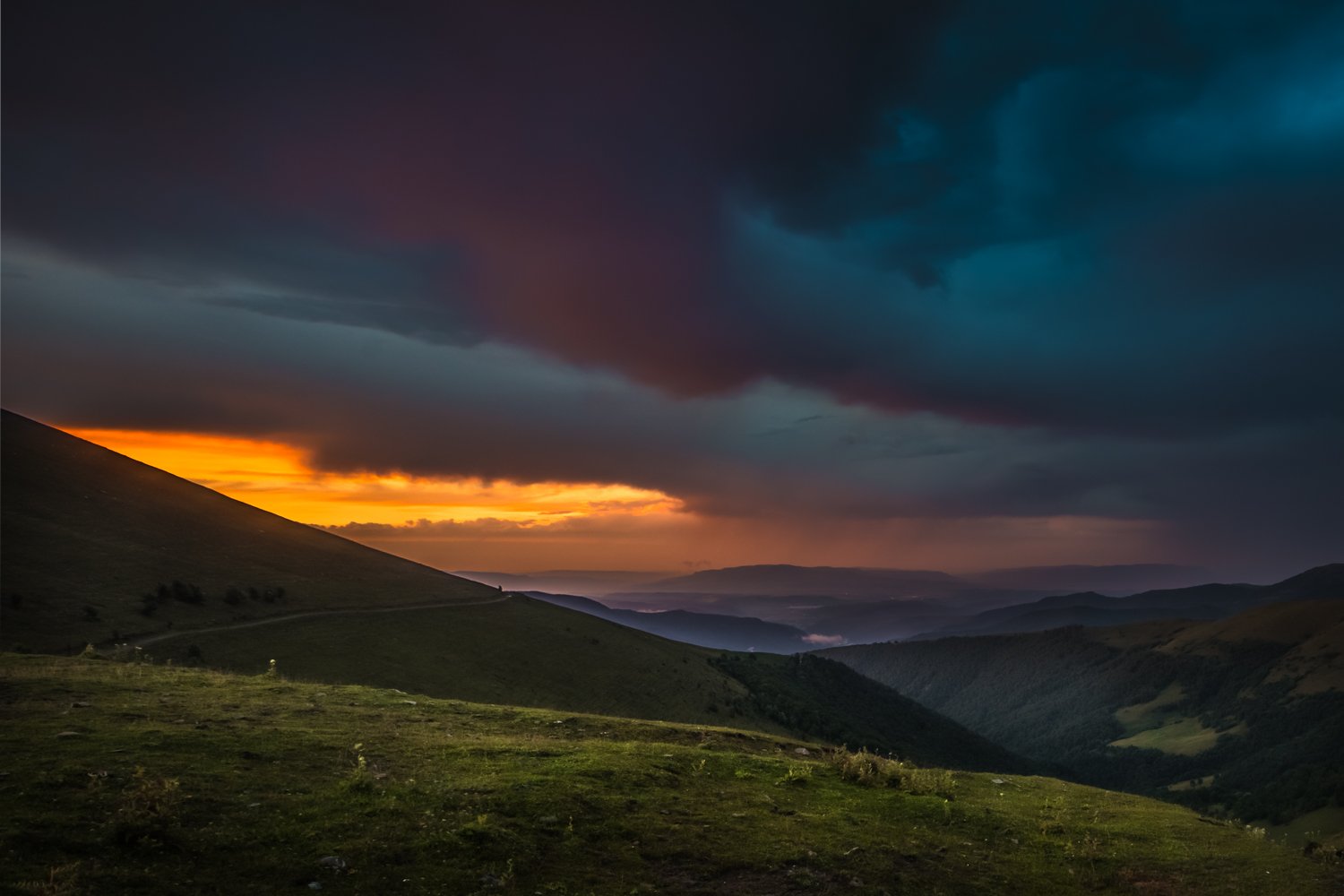 Закат на перевале Пастухова. На самом деле, лишь отсветы одного, очень мощного заката, к фотографиям которого я плавно приближаюсь в публикациях :) Настолько яркого, что отражённый от облаков свет на северо-западе смог подсветить целый склон Гороховой балки.