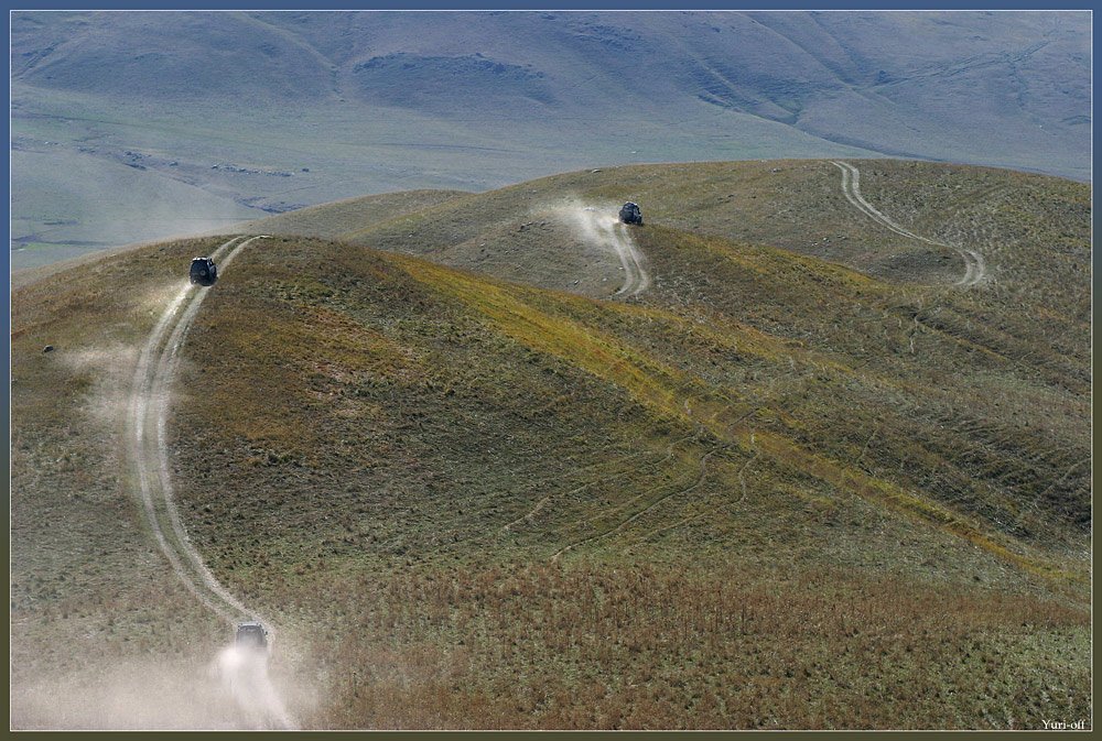 За спиной - западные отроги Джунгарского Алатау. Впереди - отроги гор Ыргайлы. Кадр, хотите - верте, хотите - нет, постановочный. Еще на разведке трасы "Тянь Шань трофи '2005" я присмотрел это место, а уже во время гонки только осталось выпустить машины с нужным интервалом :-)) Исли бы мой приятель-раздлобай, управлявший первой машиной, не остановился на следующем взгорке, то в кадре было бы 4 авто :-)