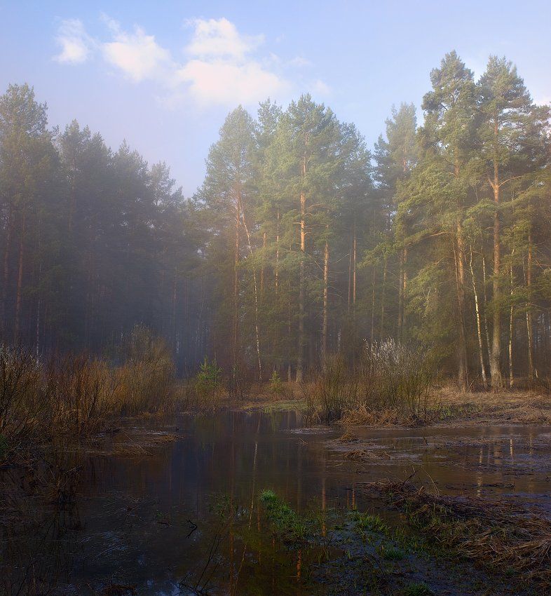 утро, туман, речка, лес, лучи, Дмитрий Алексеев