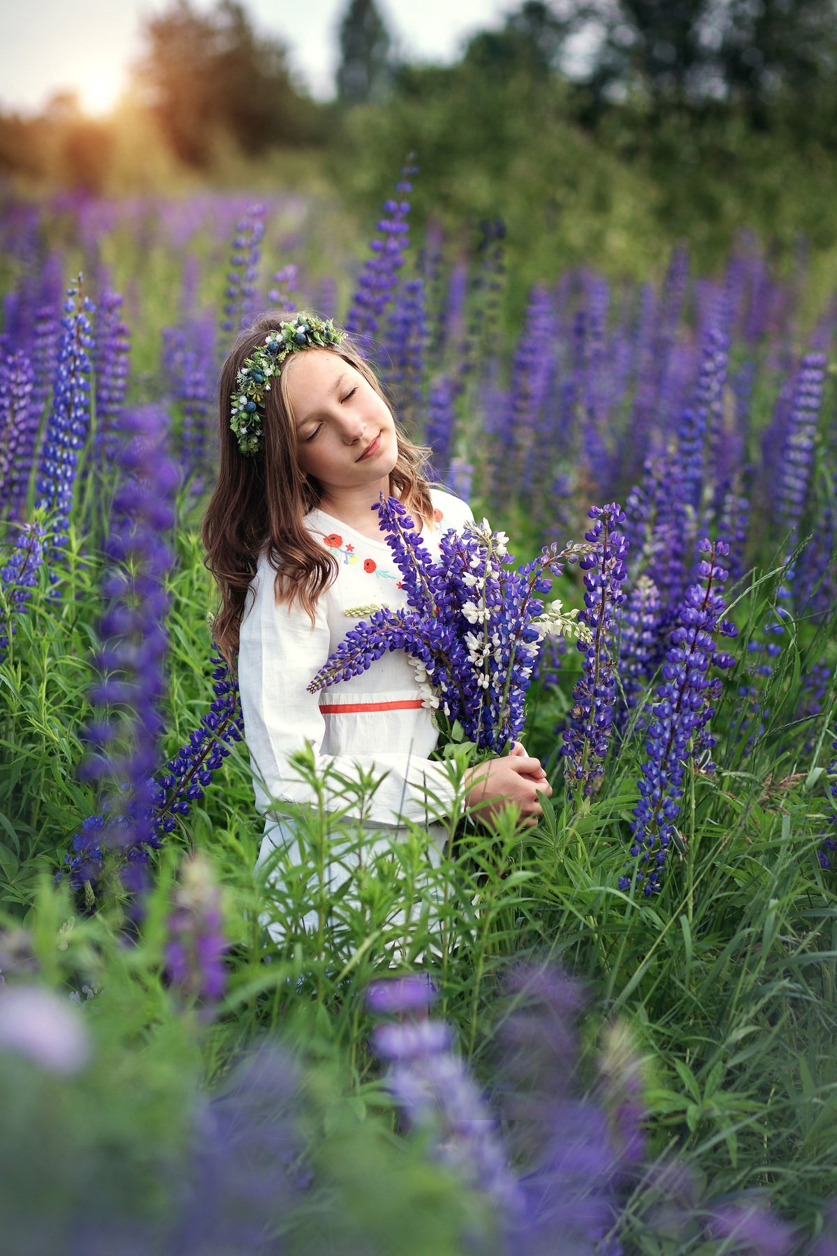 люпины, фиолетовый, синий, цветы, букет, портрет, девушка, милая, красивая, лето, закат, солнце, свет, день, умиротворение, венок, поле, дача, Мила Шелест