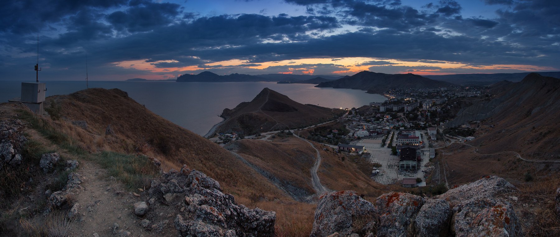 Слева направо на ЗП: мыс Меганом, Кара-Даг, за ним идёт Коктебель, мыс Хамелеон, далее темный зуб Пятого мыса, от него вправо начинается бухта Провато, потом видны огни набережной Орджоникидзе, над ней сверху г. Джан-Куторан . На среднем плане почти в центре темная горка - гора Васюкова, слева от неё пляж Васюковка в просторечии, далее налево за обрез фото уходит мыс Киик-Атлама.