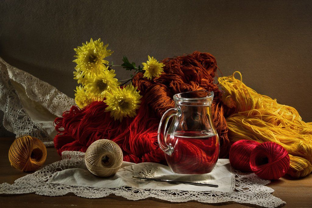 Не понятно зачем графин с водой и цветы на пряже, если тема вязание. Ну, и кроме того, все крайне постановочно.