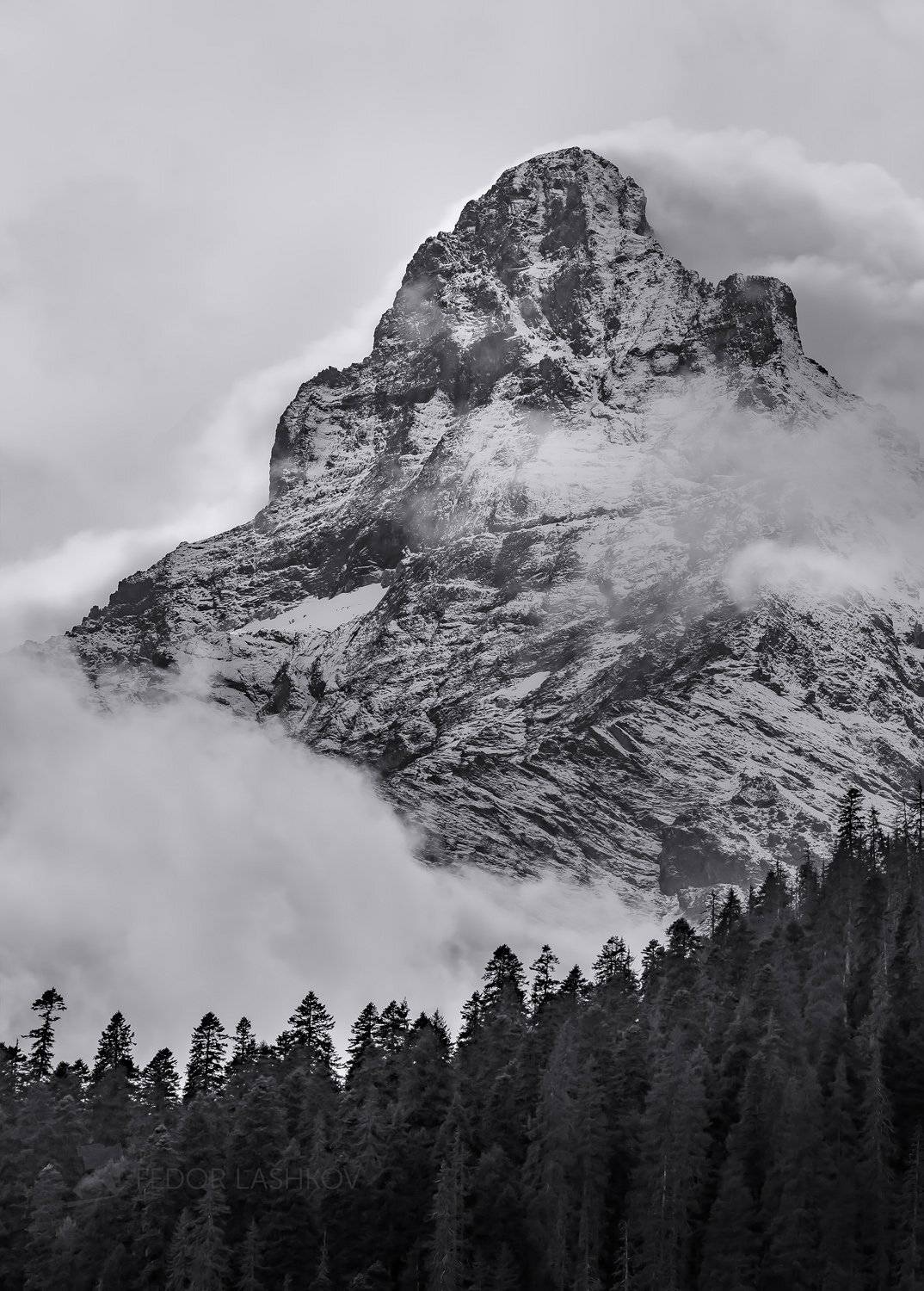 чёрно-белоепейзажгорыкавказдомбайсеверный кавказоблакаскалытучискальныйхребетвершинагора