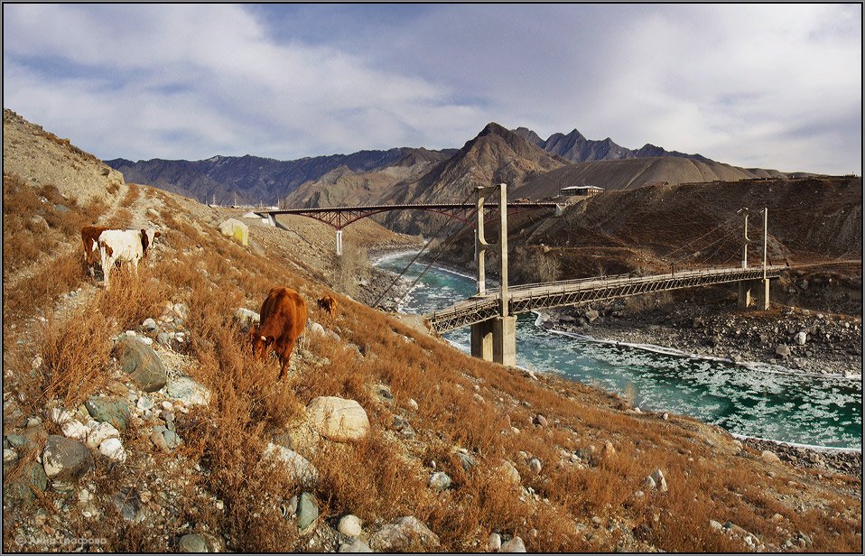 Ноябрь 2007. Мост на ПП - местная достопримечательность, первый в истории мост подобной конструкции (Цаплин С.А.), ныне уже не действующий, на заднем плане мост по которому сейчас проходит Чуйский тракт (перед с. Иня)