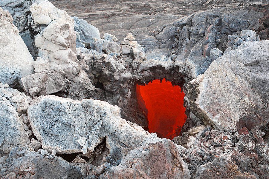 Окно лавовой трубы в котором видна остановившаяся, но все еще раскаленная лава.