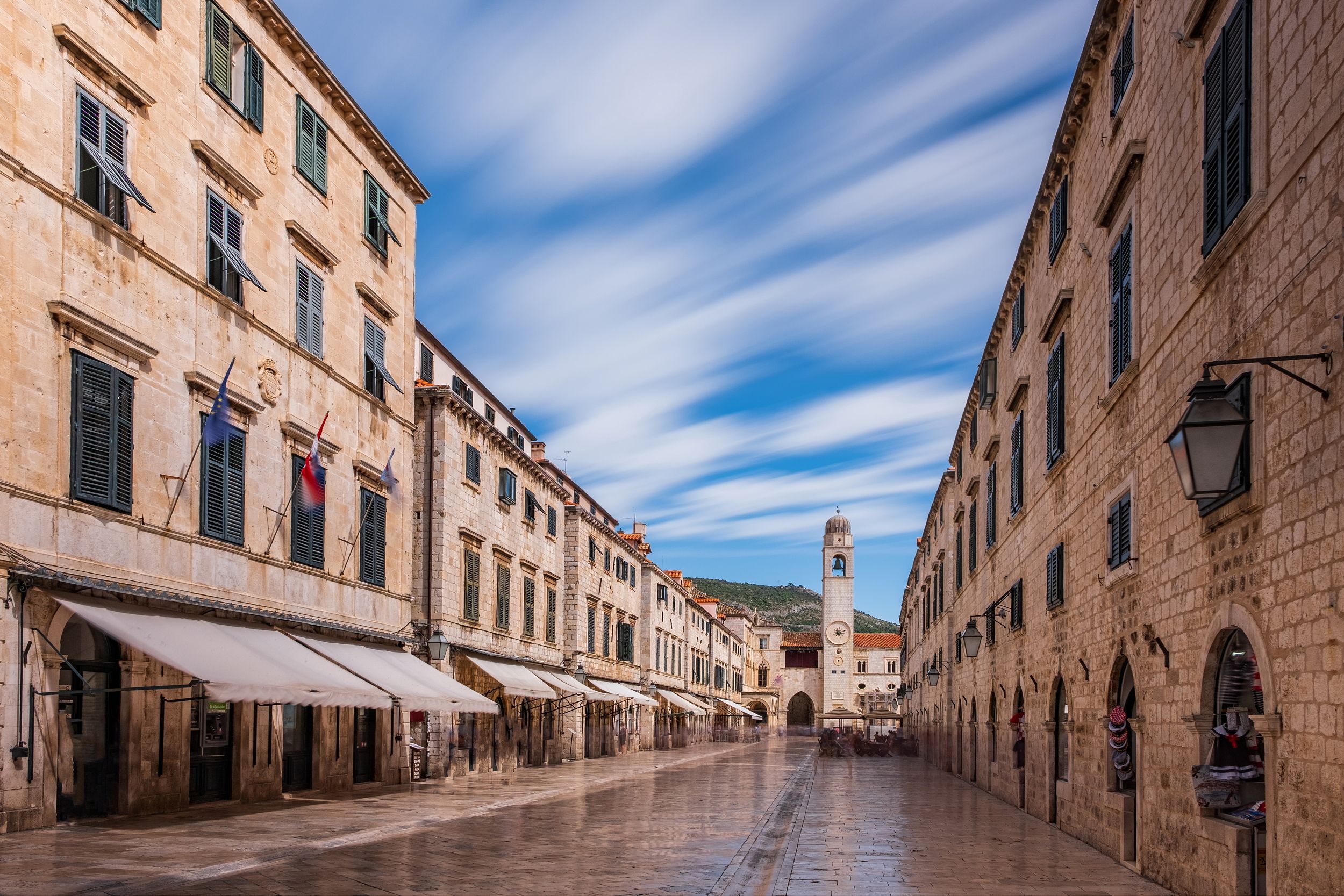 Хорватия, Дубровницко-Неретванская жупания, г.Дубровник. На фото представлена главная улица пешеходной части старого города - Страдун с часовой башней и другими зданиями, возведёнными в XVI веке.