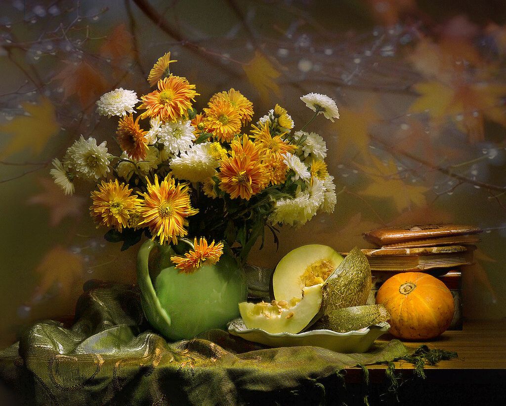 still life, натюрморт, цветы, фото натюрморт,  осень, октябрь, дыня,    настроение, хризантемы, Колова Валентина