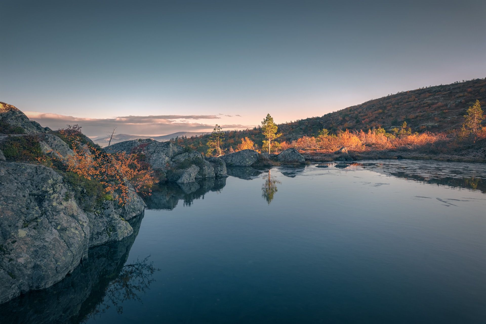 гора, озеро, лед, скалы, камни, деревья, желтый, вода, осень, сентябрь, пейзаж, природа, путешествие, заполярье, кадалакша, Андрей Чиж