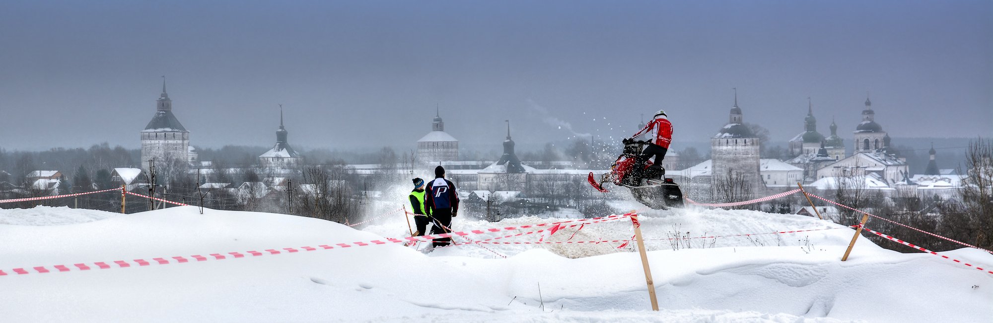 Да, зрелищно было. Это 23 февраля проводили праздник "В снегах Кириллова" и в рамках этого соревнования по снегоходному кроссу. Нащелкала много, один из моментов показался наиболее интересным.
