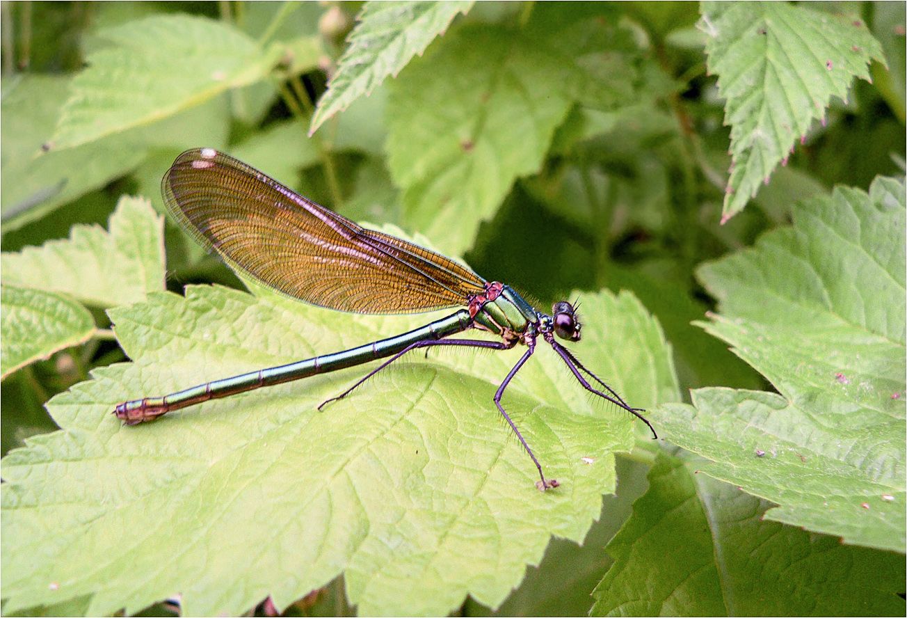 Красотка-девушка, или красотка темнокрылая (лат. Calopteryx virgo) — стрекоза, принадлежащая к семейству Красотки. На фото - самочка. У самцов крылья блестяще синие...