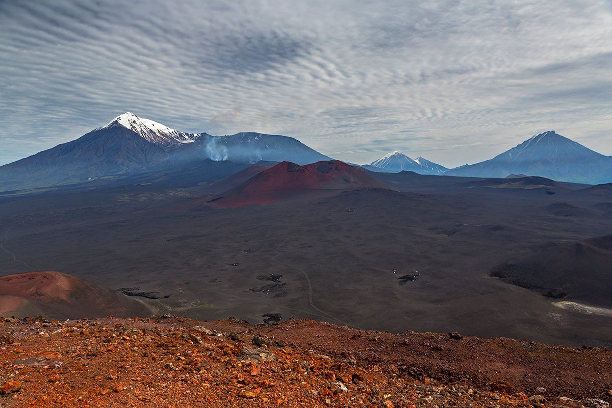 Плато Толбачика образовавшееся в результате трещинновых извержений. Последние из которых началось 27 ноября 2012 года. Небольшой думок на дальнем плане это очаг последнего извержения.